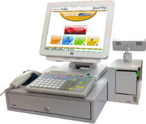 一体型タッチPCとレジユニットSを組合せた最新の構成モデル。(画面は液晶タッチディスプレイ使用)